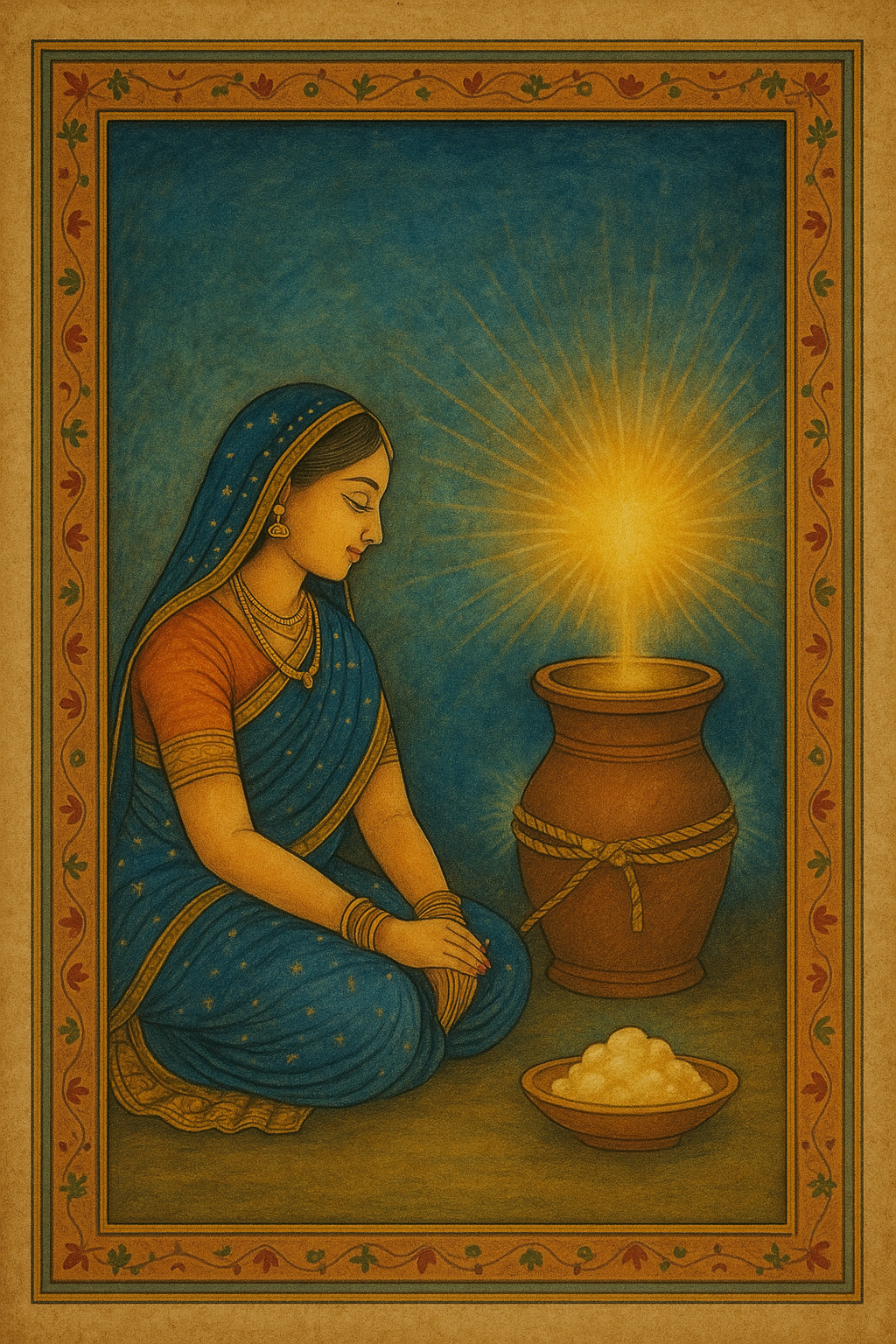 A quiet village kitchen. A wooden churn hums. Bangles sing. A sari sways. Yashoda moves with a gentle rhythm, her attention resting on the simple holiness of the morning. Krishna arrives, bright and hungry, tugging for milk. She gathers Him close, warmth answering warmth.