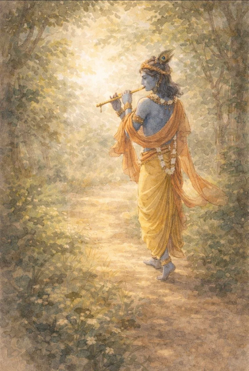 The village continues. Homes are busy. Work waits. The day looks normal from the outside. And yet, for the Gopis, the day carries a different texture. Their minds follow Him, not by effort or strategy, but the way a river moves toward what it knows.